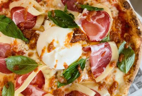Crème de petits pois, mozzarella fior di latte, pesto rouge, jambon San Daniele et burrata fritta.