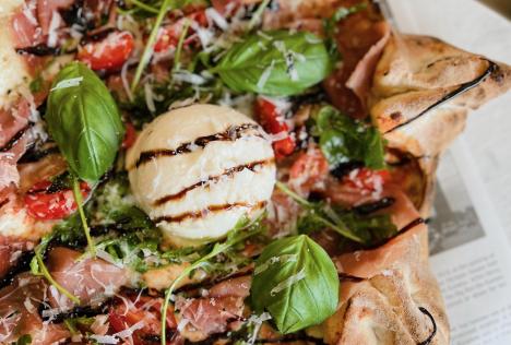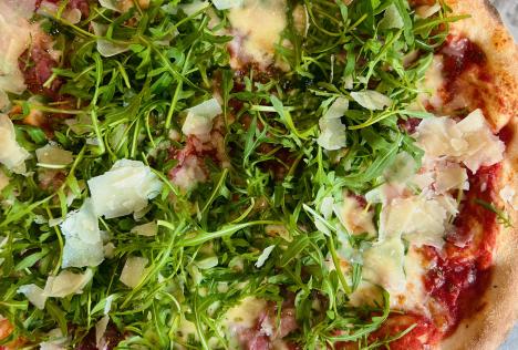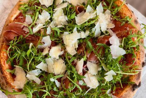 Tomates, mozzarella, oignons, roquette, jambon San Daniele, copeaux de parmesan