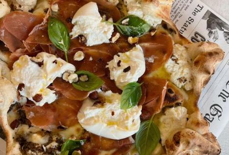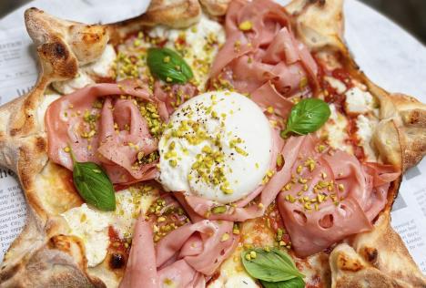Crème de petits pois, mozzarella fior di latte, pesto rouge, jambon San Daniele et burrata fritta.