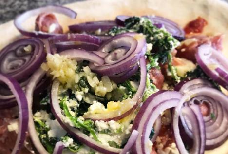 Tomates, mozzarella, oignons rouges, ricotta, épinards, saucisse italienne