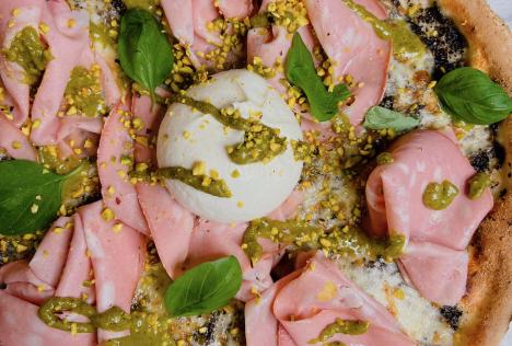 Mozzarella fior di latte, crème de truffe noire, pesto de pistaches, mortadella, burrata, pistaches concassées
