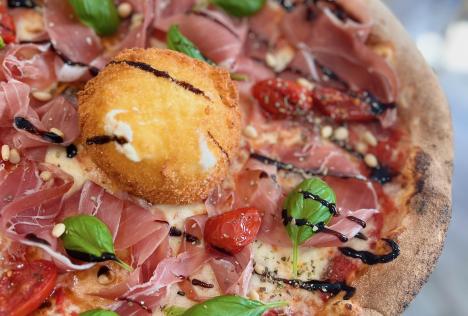 Crème de petits pois, mozzarella fior di latte, pesto rouge, jambon San Daniele et burrata fritta.