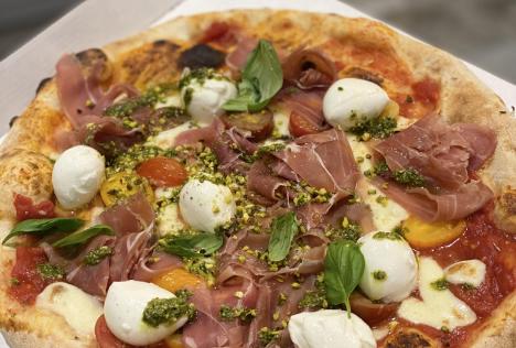 Mozzarella fior di latte, pesto, mortadella, stracciatella, pistaches, basilic frais