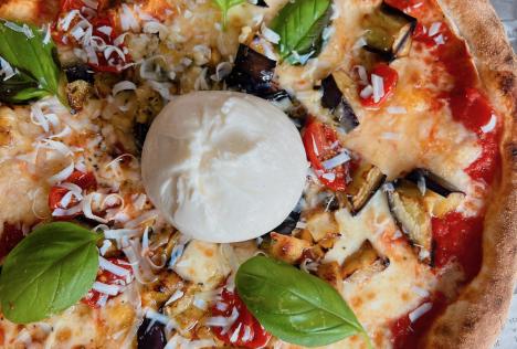 Tomates San Marzano, mozzarella fior di latte, aubergines frites, tomates cerises séchées, parmesan, Burrata, ricotta rapée et basilic frais